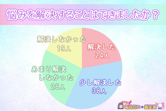 しかし、「あまり解決しなかった」または「解決しなかった」と答えた人も合計47人おり、すべての占い師が良いかと言われると疑問が残る内容になりました。