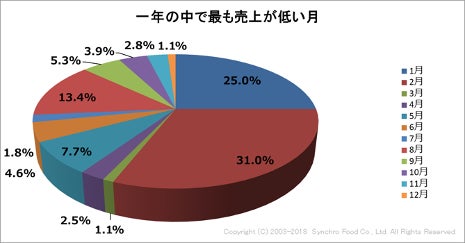 「ニッパチ」という言葉がある通り、一般的に2月・8月は宴会需要が少ないと言われています。実際に「飲食店リサーチ」が実施したアンケート調査では、2月が最も売上が低く、次いで1月、8月が低いという結果が出ています。(※図3)