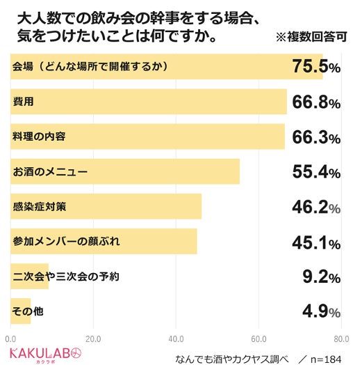 大人数での飲み会需要が増える中で、レンタルスペースやオフィス内での飲み会開催が増えてきています。特にレンタルスペースにおいては、人数に対して広めのスペースを確保し密を避けられる、換気しやすい屋外やテラスが選べるといったメリットが需要増加の理由です。インターネット調査でも「大人数での飲み会の幹事をする場合、気をつけたいことは何ですか。」という質問に「会場(どんな場所で開催するか)」と答えた割合が70%を超えました。(※2)