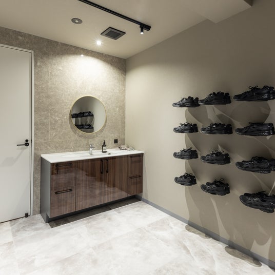 モノクロを基調としたトレーニングエリアと違いホテルライクな雰囲気に作り上げた更衣室は大人な空間と仕上がっています。
