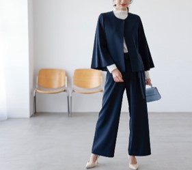 ■特長:ケープ風シルエットで女性らしくこなれ感のあるスーツ。ゆったりとした着心地と、きれい見えを両立するジャケットは、さっと羽織るだけでトレンド感のある印象を与えます。美ライン見えにこだわったワイドパンツとのセットアップで、バランスの良いスタイルが完成します。
