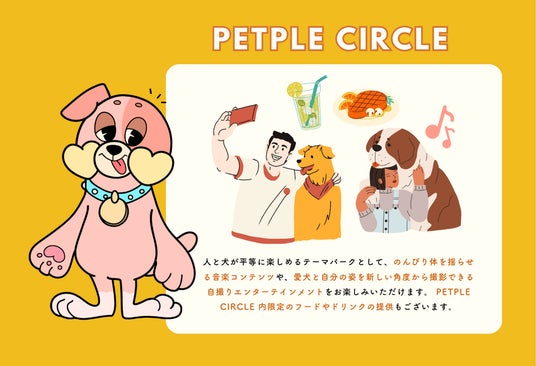 人と犬が平等に楽しめるテーマパークとして、のんびり体を揺らせる音楽コンテンツや、愛犬と自分の姿を 新しい角度から撮影できる自撮りエンターテインメントをお楽しみいただけます。 PETPLE CIRCLE 内限定のフードやドリンクの提供もございます。