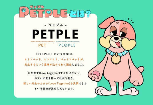 今回新しく誕生した“PETPLE”という言葉には、ヒト×ペット、ヒト×ヒト、ペット×ペットが、ただ共生(Live Together)するだけだなく、お互いに愛を持って社会を創り、新しい共生のカタチ(Love Together)を実現できるという意味を込めました。
