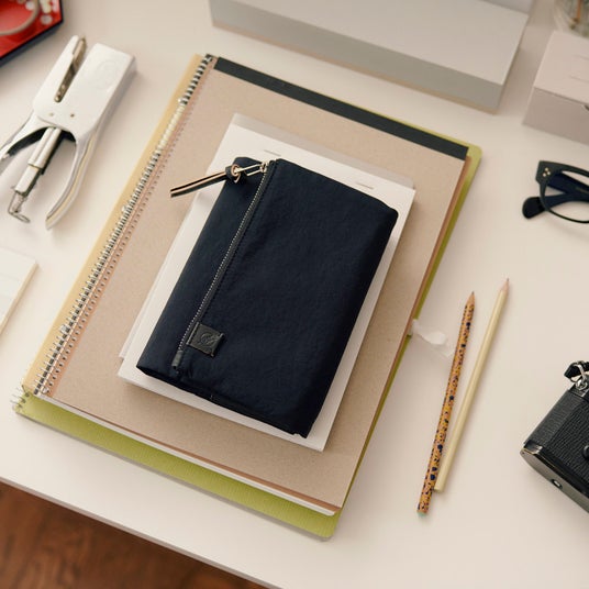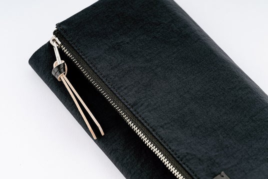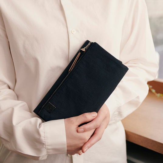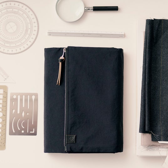 手帳といっしょに、文具など大切なツールを持ち運べる、スマートな手帳カバーを作りました。名前は「tragen(トラ―ゲン)」。ドイツ語で「持ち運ぶ」という意味です。たっぷり入るポケットが特長ですが、見た目はどこまでもシンプルでスマート。マグネット仕様の三つ折りながら、軽やかな持ち心地であることもポイント。かざらないのにかっこいい、そんなさりげない美しさを目指しました。生地は、上品な光沢のあるやわらかなナイロンで、表にはレザーの引き手がついています。3つのサイズで新登場です。