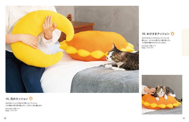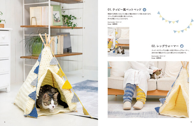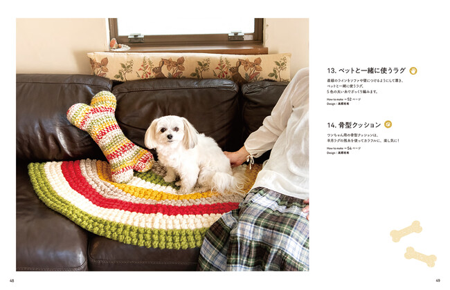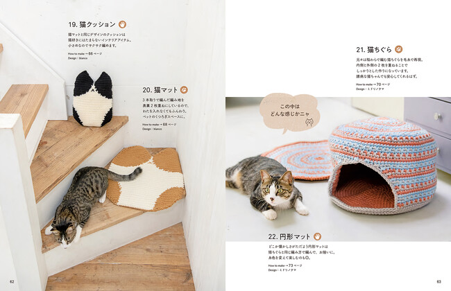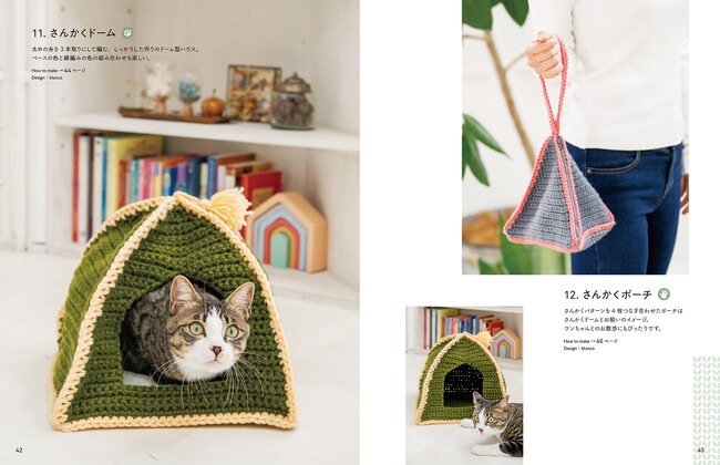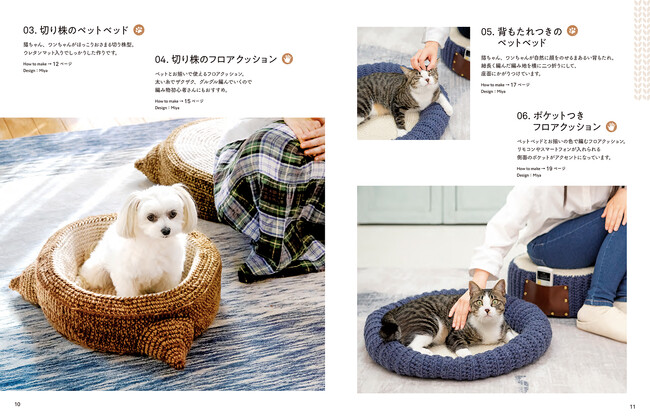 にゃんこやワンコがすっぽりおさまる大きなベットや、ちょこんと座れるクッション、飼い主さんとお揃いで一緒に使えるニット小物24点を紹介します。