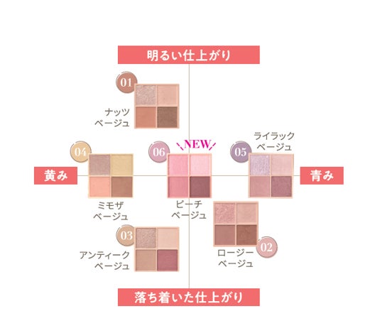 今回登場する「06 ピーチベージュ」はニュートラルカラーなので、肌のトーンを問わない、使いやすいカラーパレットです!