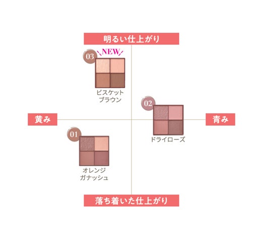今回は、こなれ感のある大人の印象に仕上げる印象に仕上げる「03 ビスケットブラウン」が新色として登場。ベージュ以上ブラウン未満の絶妙ブラウンでやさしく目元を引き締めます。