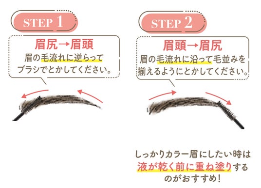 設計。ブラシの等間隔の隙間により、眉毛に液がキレイにのりやすく、とかすように使うと眉頭~眉尻まで毛流れも自由自在に仕上げられます。眉頭を立ち上げ、今っぽい立体眉も演出できます。