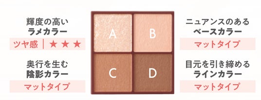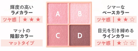 しっとりとろけるような柔らかな粉質。B,C,Dのパールカラー・マットカラーは 、