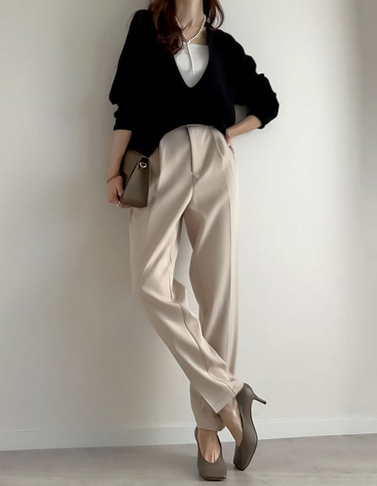ヒップまわりにややゆとりを持たせる事で、楽な着心地と綺麗め見えを両立させたテーパードパンツです。