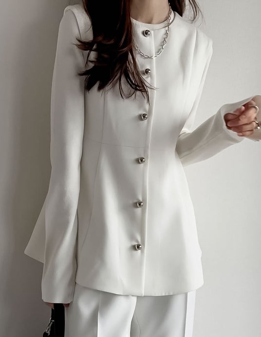 シンプルコーデを華やかに見せるフェミニンなペプラムシルエットに、モードな印象のメタルボタンをプラスしました。