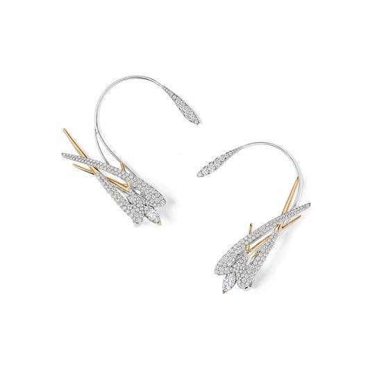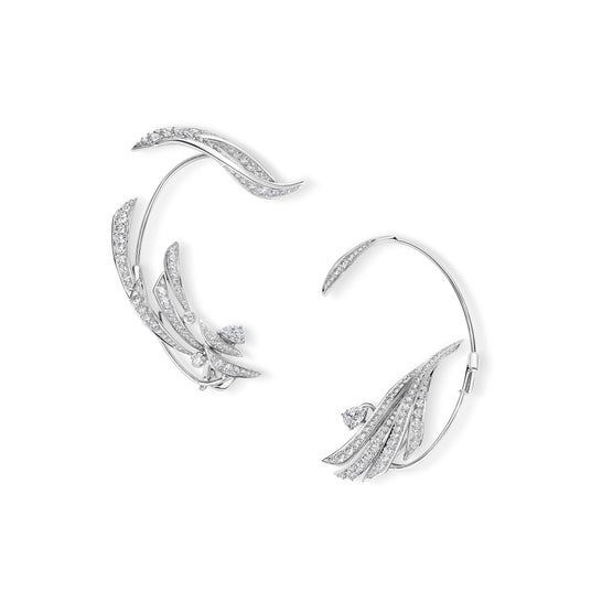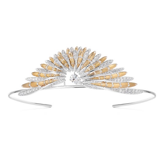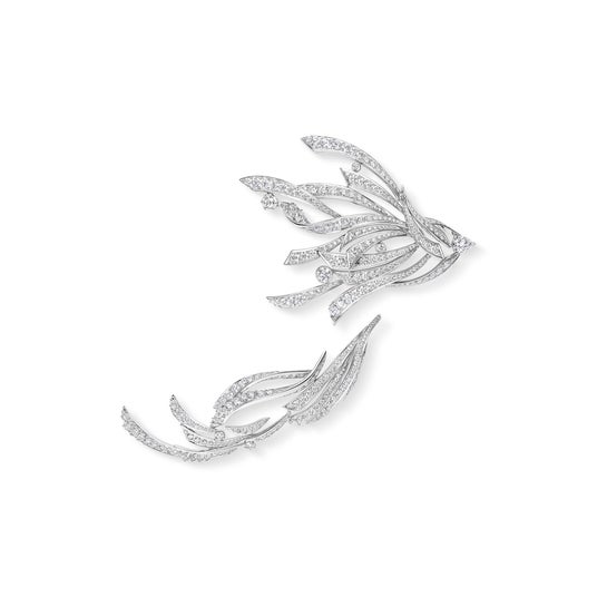 黄金の羽根を意味するPlumes d’Or <プリュム ドール>は、時代や大陸を超えて高い精神性を想起させるといわれる鳥、“キジ”からインスパイアを受けてデザインされました。ショーメのゴールドスミス(金細工師)としてのルーツと、代々受け継がれてきた技術を讃えています。交互に配された羽根は、サテン仕上げのピンクゴールドとダイヤモンドをセッティングしたホワイトゴールドで仕立てられ、風に運ばれ舞い上がるような軽やかさが表現されています。