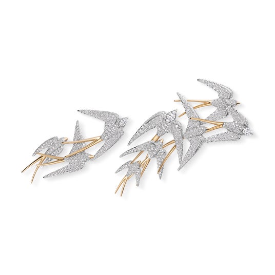 19世紀からメゾンに愛されてきた魅惑的な鳥のひとつである“ツバメ”は、恵みと希望の使者として愛を表現する鳥といわれています。自然主義のジュエラーであるショーメが得意とする緻密な自然観察に基づいてデザインされたBallet<バレエ>は、流れるようなビーズセッティングと繊細なデサンデュセッティングを織り交ぜ、ツバメの愛らしく丸みのある自然な姿を表現。春の空にまるでバレエを踊るかのように飛びまわる瑞々しい姿を表現しています。
