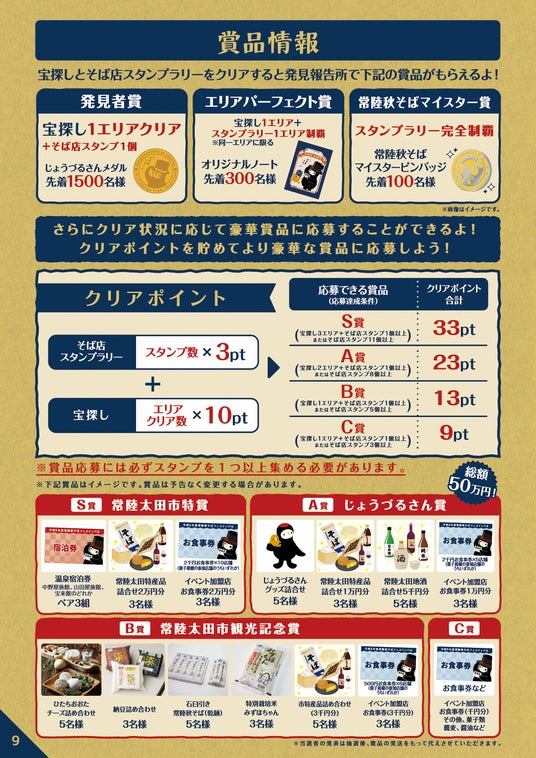 先着でもらえる参加賞として、宝さがし1エリアクリア+そば店スタンプ1個を集めた方に「じょうづるさんメダル」、エリアパーフェクト賞として、宝探し1エリア+スタンプラリー1エリア制覇された方に「じょうづるさんオリジナルノート」などもご用意しています。