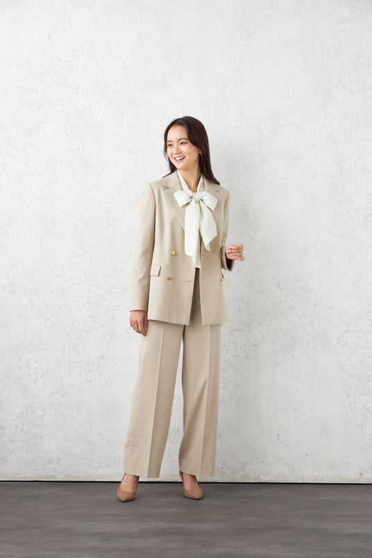 ジャケットは4つボタン仕様にすることで、スカートやワンピースなどカジュアルなアイテムとも合わせやすく、オンでもオフでも着まわしやすいようアップデートいたしました。パンツはすっきりとしたワイドシルエットを継続。身体のラインを拾いにくいシルエットで、脚をあまり出したくない方にもおすすめです。もちろんマシンウォッシャブル可能でお手入れしやすいのも特長です。