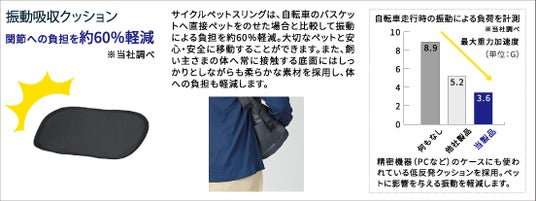 「サイクルペットスリング」は、自転車バスケットにしっかりとホールドできる2箇所の固定ベルトで、転倒時もスリングが飛び出さず安全です。ペットの飛び出しを防止するリードホルダーや、内側から開けられないロック式ファスナーも備えています。底面の振動吸収クッションにより、直接乗せた場合と比較し振動による負担を約60%軽減します。従来のペットスリングは底も柔らかい製品が多いですが、安定した底面があることで安心した移動が可能に、また自立設計なので乗せ降ろしがラクになりスムーズな出発をサポートします。2箇所のメッシュウィンドウで通気性も抜群、雨の日にも安心な撥水加工を施しています。