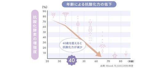 私たちの体には、活性酸素の影響を和らげる抗酸化作用が自然と備わっており、これによって老化の進行を抑える力があります。体内で生成される抗酸化酵素は、年齢と共にその能力が衰え、特に40歳を超えると減少のペースが加速します。