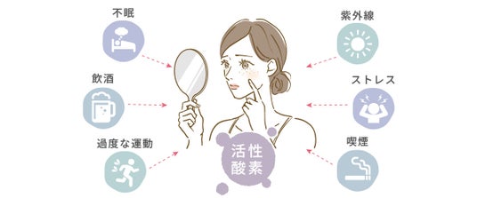 そもそも、酸化ストレスとは、体内で悪さをする「活性酸素」という物質が多くなりすぎる状態です。この活性酸素が多くなると、細胞が傷つきやすくなります。特に、細胞膜やDNAがダメージを受けると、細胞が劣化・死滅してしまいます。つまり、細胞が「錆びる」ようなもので、これが積み重なると体全体が老化してしまうのです。活性酸素は普段から少しずつ作られては抗酸化作用によって消えているのですが、そのバランスが崩れると問題が起きます。このように細胞への酸化ストレスが老化の一因とされているのです。