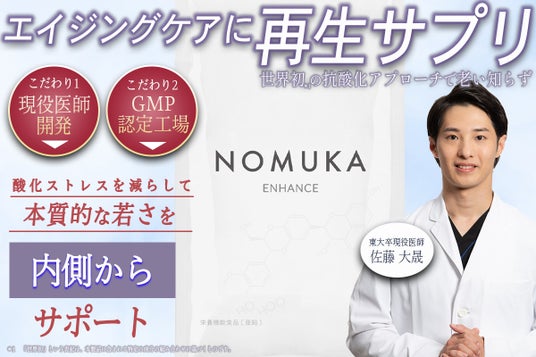 NOMUKA ENHANCEは、従来の抗酸化物質を摂る方法ではなく、体内でもともと作られている抗酸化酵素のはたらきをサポートするというコンセプトで、東大卒の現役医師が開発したサプリメントです。