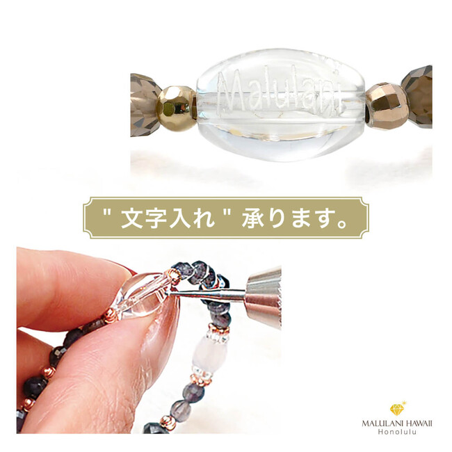 ご希望の方には、プラス2,000円(税込2,200円)で、お好きな英数字6文字までの刻印を承ります。 お名前やイニシャル、記念日やお好きな言葉などを刻んだブレスレットは、特別なお守りとなるでしょう。