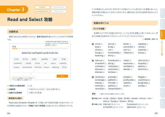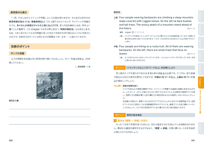 本書は、Duolingoから提供した画像を交えながら、DETの全13種類の出題形式について徹底的に解説。DETを分析し尽くしている著者だからこそ提供できる、「解答時の心構え」や「攻略のポイント」などを掲載しています。また、各問題の出題頻度、試験時間の有効な使い方、他の英語試験では見られない出題形式の攻略法、ライティングやスピーキングの解答で高得点を取るための方法など、スコアに直結するポイントを余すところなく知ることができます。