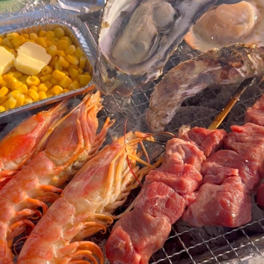 サザエ/ホタテ/ホッキ/エビ/イカなどの魚介類はもちろん、牡蠣フライ/牡蠣ごはん/牡蠣汁/牛串/牛タンつくね/フランクフルト/フライドポテト/コーンバター等々。多種多様なフードやドリンク(ソフトドリンク300円アルコール500円~)も用意。※品切れの場合あり