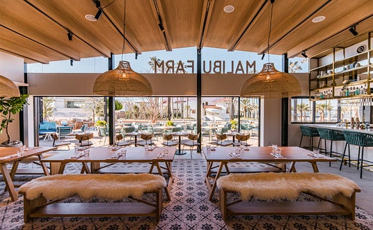 『マリブファーム 逗子マリーナ』では、現地の人気メニューのほか、地元湘南の新鮮野菜や相模湾の魚介類を使用した日本限定メニューもご用意しています。全開可能なサッシによりテラス席と内部が一体となる設えで、約50席の屋内席の他、マリーナの海からつながるような大きな水盤が広がる約80席のテラスには、三方を水に包まれたウォーターテラス席や暖炉を囲むファイヤーテラス席など、シチュエーションに応じてお使いいただけます。豊富なテラス席を有するため、ペット同伴でのお食事に最適なレストランです。