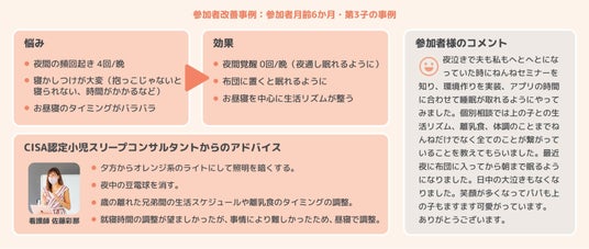 ・睡眠コンサルタントの方と直接個別に相談ができたのはとても良かったです。アドバイス通りにやったところ、数日で夜はセルフねんねができるようになり、「寝かせなきゃ」という気持ちがとても楽になりました。(13ヵ月のお子さんのママ)