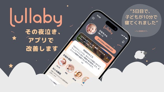 Lullabyは乳幼児の夜泣き・寝かしつけに悩むママ・パパを包括的にサポートする 3 つのサービスが備わったアプリサービスです。3 児の母で東大医学部卒・医師の森田麻里子氏を監修医として迎え、科学的根拠に基づいたデータの使用に拘り、更に日本の住環境・生活に合った情報提供を最重要視することで、忙しいママ・パパでもすぐに活用できるアプリとなっています。