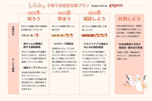 ママ・パパに向けては困ったときに必要なサポートが受けられる伴走型の支援を、自治体に向けては規模や支援程度の希望に沿う形で提供するために、3ステップでの支援が可能な『子育て伴走型支援プラン※3』を提供いたします。
