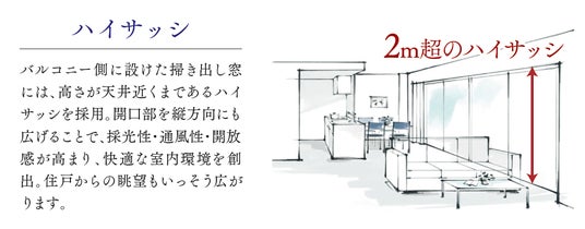 プランは、全居室に開口部を確保した住戸やルーフバルコニー付き住戸など、幅広い世代やライフスタイルに対応する、1LDK~4LDK(44.32平方メートル ~110.92平方メートル )、全26タイプの多彩なプランを用意しています。高台立地と南向き斜面を臨む眺望を享受できるよう、全戸2m超のハイサッシと扁平梁を採用し、明るく開放的な住まいを実現します。