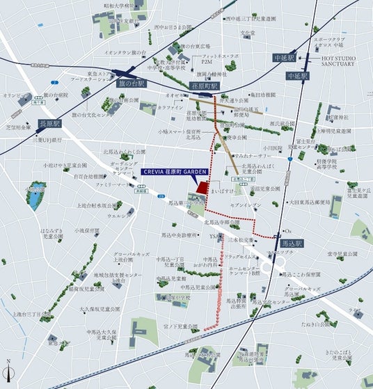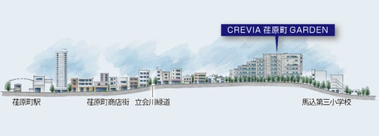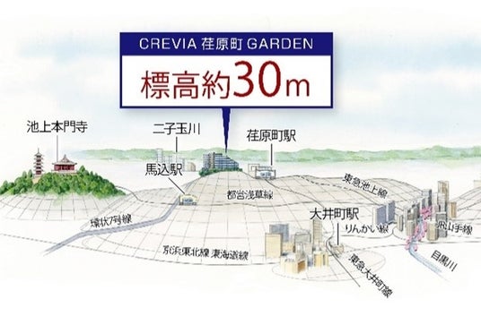 「クレヴィア荏原町GARDEN」は、南向きの傾斜を臨む、見晴らしの良い、標高約30mの高台に位置しています。東急大井町線と東急池上線、都営浅草線の3路線が利用可能で、徒歩7分の東急大井町線「荏原町」駅までは傾斜のゆるやかな、なだらかなアプローチとなっております。また、荏原町駅前の「荏原町商店街」や旗の台駅周辺の「旗の台東口商店街」などが身近にあり、徒歩10分圏内にスーパーや病院などの生活利便施設が揃う利便性の高いエリアでありながら、幹線道路から離れた住宅街のため、落ち着いた住環境も享受できるロケーションです。