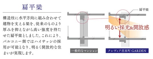 本物件は、標高約30mの高台立地と南向きの斜面を臨む恵まれたロケーションを活かし、プランにおいては2m超のハイサッシと扁平梁を採用し、開放感と採光に優れた住戸を目指しました。加えて、家族構成や多様なライフスタイルに合わせて選べる1LDK~4LDK、全26タイプの豊富なバリエーションを用意しています。