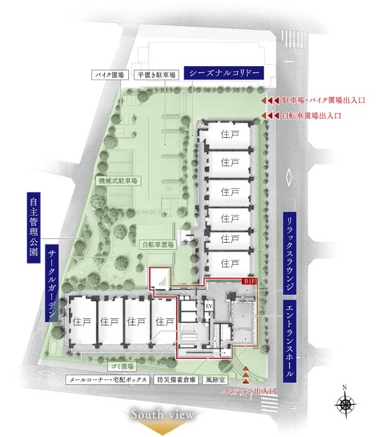 3,000平方メートル 超という敷地面積の広さを生かし、敷地内は緑あふれるランドプランとしました。自然に親しめる憩いの場として、サークルガーデン(中庭)をはじめ、地域に開かれた自主管理公園を設置、四季の風情と彩りが豊かなシーズナルコリドー(散歩道)も備えました。敷地の外周部にも植栽帯を配しており、街の緑化にも寄与します。