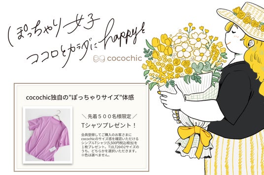 2024年1月31日オープンのぽっちゃり女子ブランドcocochicが、ブランドデビューにあたり、大きいサイズではない“ぽっちゃり”のためのサイズTシャツを先着500名様にプレゼント。