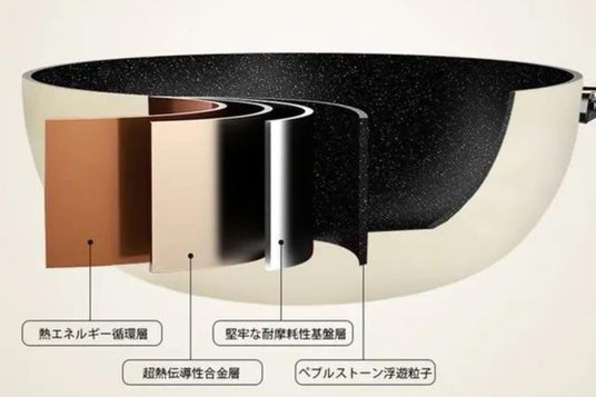 VELOSANフライパンは、軽くて熱の伝わりの早い欧州規格アルミ素材を用いた厚さ3.5mm、4層構造の設計により、抜群の蓄熱性を実現。加熱開始後、素早く均一にフライパンが温まります。