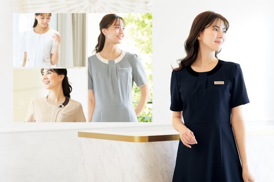 着心地を追求したベーシックな事務服と、医療施設・美容クリニック受付などに向けたメディカルウェア素材のワンピースが登場。