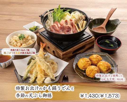 九州産のかつおと北海道産の昆布で丁寧にひいた、ひまわりの”特製お出汁”とあい鴨をたっぷり使用した鴨鍋うどんに名物玉子焼と季節の天ぷら 季節の炊き込みご飯がついた、ひまわりのお出汁を存分に味わっていただけるメニューです。