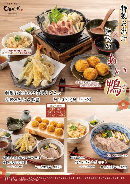 寒さが厳しさを増す季節に、だしの風味と鴨の旨味で心も体も温まっていただけるよう、ひまわりの”特製お出汁”とあい鴨にひまわり名物玉子焼(明石焼)とセットにしたメニューや、季節限定天ぷら盛り合わせと組み合わせたメニューを販売中です。この機会にぜひご賞味ください。