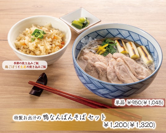 九州産のかつおと北海道産の昆布で丁寧にひいたひまわりの”特製お出汁”であい鴨炊き上げた、旨味たっぷりの鴨なんばんそばに季節の炊き込みご飯がついたホッとする温かいメニューです。
