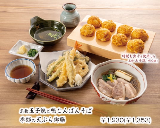 九州産のかつおと北海道産の昆布で丁寧にひいた、ひまわりの”特製お出汁”をたっぷり使用した名物玉子焼と特製お出汁であい鴨を炊き上げた旨味たっぷりの鴨なんばんそばに季節の天ぷら盛り合わせがついたひまわりでしか味わえないメニューです。