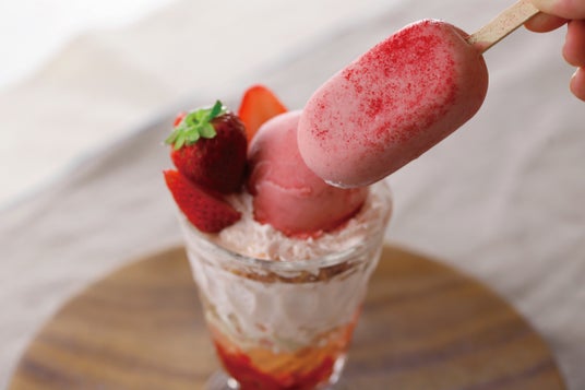 アイスをそっと持ち上げて、可愛らしいいちごの世界をお楽しみください。