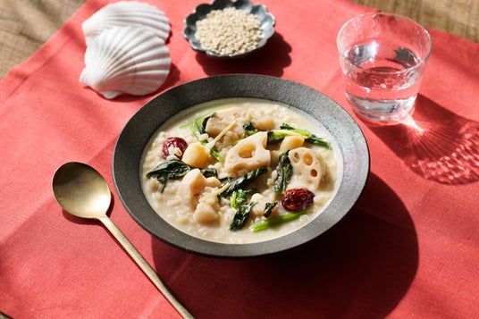 鶏白湯と貝だしの旨みたっぷりのスープに、生姜やれんこんなどの身体を温める野菜をふんだんに使った、寒い日の朝食にぴったりのスープごはんです。