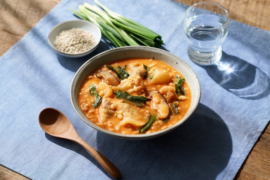 牛だしとコチュジャンベースのピリ辛スープに、しいたけや豚バラ肉の旨みが溶け込んだユッケジャン粥。