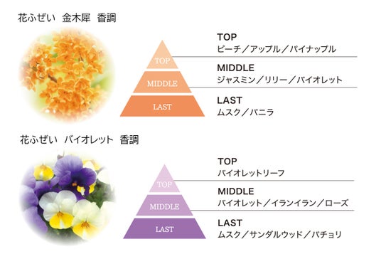 金木犀とバイオレットが加わり、花ふぜいシリーズの香りラインナップが全8種となりました。