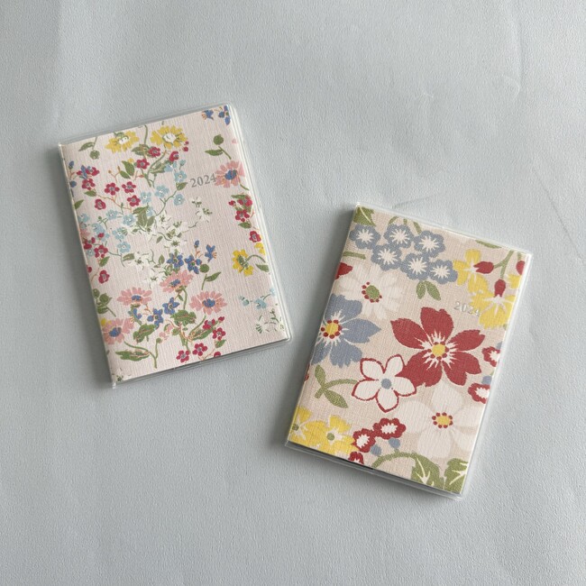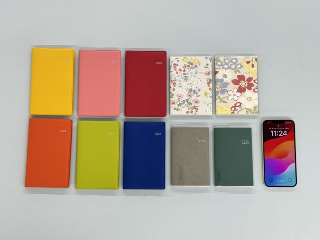 2024年度版4月始まり手帳の新作10点は、どれもスマートフォンと同程度のコンパクトサイズ。コンパクトながらもカバーの色柄が豊富で、中身の機能性も高いアイテムをそろえました。