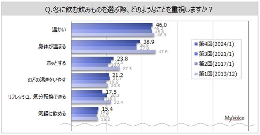 マイボイスコム株式会社(東京都千代田区、代表取締役社長:高井和久)は、4回目となる『冬に飲むもの』に関するインターネット調査を2024年1月1日~5日に実施しました。