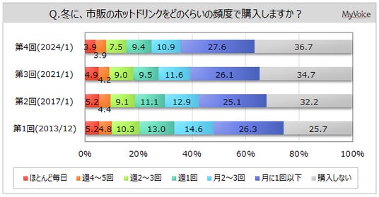冬に市販のホットドリンクを購入する人は6割強、過去調査と比べて減少傾向です。