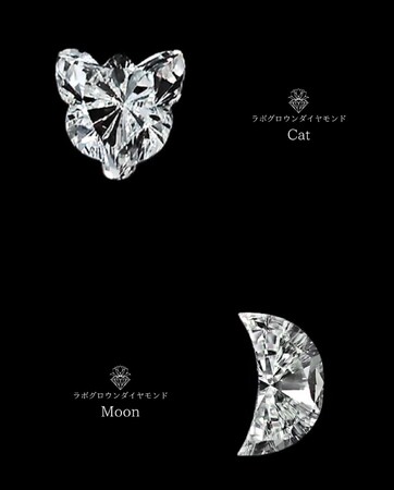価格が安い“ラボグロウンダイヤモンド”だからこそ思い切ったカットの加工にも挑戦でき、このトパーズなどほかの石では見かける猫や月の形をダイヤモンドで実現しました。