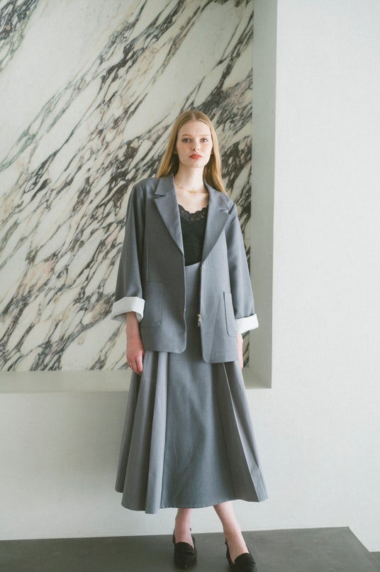 FrontZipWideSleeveJacket beige/gray ¥8,800 tax in / ArchSwitchingPleatsSkirt beige/gray ¥7,150 tax in